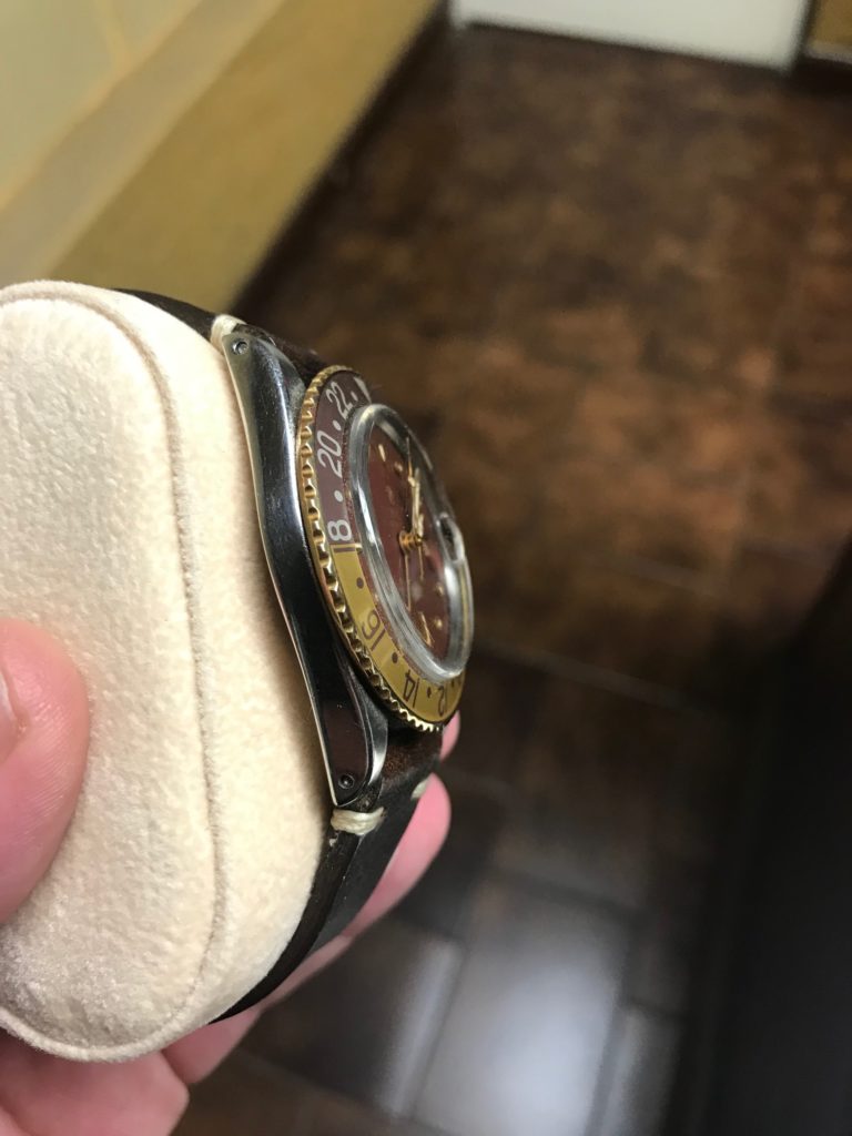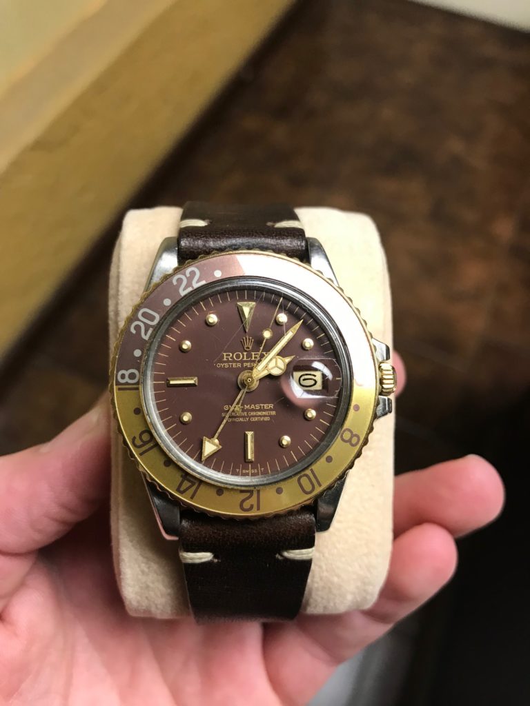 Rolex GMT Master 1675 (Root-beer) Publicada en noviembre 30, 2019diciembre 4, 2019 por admin Chocolate nippel dialYear: 1972Beautiful faded bezelOn a beautiful leather strap with a rolex buckle INQUIRE FOT THIS WATCH